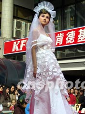 二月十六日,北京西單一家婚紗影樓借情人節(jié)刮起的浪漫旋風(fēng),不失時(shí)機(jī)地舉辦了一場婚紗秀,吸引了不少觀眾。作者:杜洋