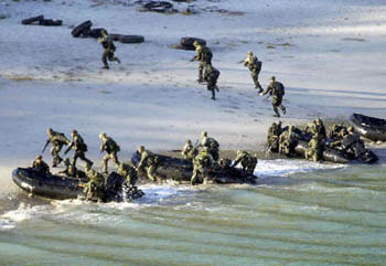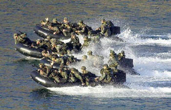 為鏟除阿布沙耶夫恐怖組織,美海軍陸戰(zhàn)隊18日在馬尼拉以南島嶼與菲律賓軍隊舉行聯(lián)合軍事演習。圖為:美海軍陸戰(zhàn)隊西棲搶灘登陸。