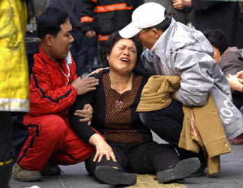 韓國(guó)警方表示,韓國(guó)當(dāng)?shù)貢r(shí)間18日上午9:55韓東南部城市大丘發(fā)生地鐵縱火事件,造成百余人傷亡。圖為遇難者家屬痛哭欲絕。