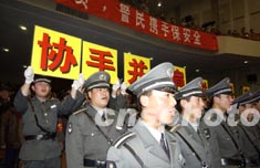 北京西城警方二月十八日舉行“兩會”保衛(wèi)誓師大會,來自公安、武警、工商、城管、保安等相關部門的兩千余人參加了大會。作者:任海霞