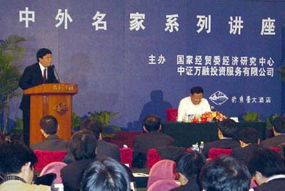 據(jù)了解,“中外名家系列講座”是由國家經(jīng)貿(mào)委經(jīng)濟研究中心和中證萬融投資服務有限公司聯(lián)合主辦。自2001年9月起已舉辦了37期(每月2期),受到社會各界特別是企業(yè)界的廣泛好評。參加此期講座的嘉賓中,有來自企業(yè)界的知名人士及各大媒體領導。此期講座由專項部主任支東升主持。