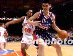 二月二十五日,休斯敦火箭隊(duì)在紐約麥迪遜花園球場(chǎng)挑戰(zhàn)主場(chǎng)作戰(zhàn)的尼克斯隊(duì)。這是效力于火箭隊(duì)的中國球員姚明本賽季首次在紐約亮相。