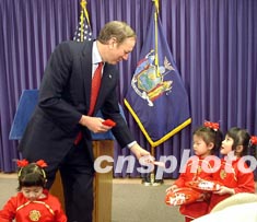 紐約州州長柏塔基二月二十六日在其位于紐約曼哈頓中城的辦公室舉行儀式,向亞裔社區(qū)恭賀羊年新春。柏塔基按照華人的傳統(tǒng)習(xí)慣給前來表演助興的華裔兒童發(fā)“賀歲紅包”。作者:趙海燕