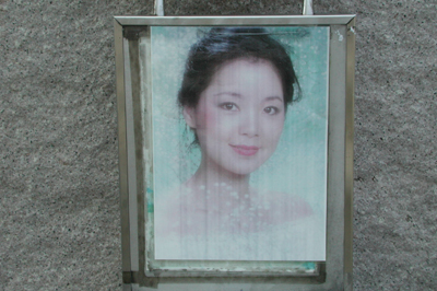 公園內(nèi)還有小憩之地,游人可以在這里邊休息邊聽鄧麗君的歌曲。小憩之地在廣場(chǎng)的旁邊,有石桌、石凳,是一個(gè)露天棚的形狀,上面是樹枝垂伏。這里最引人注意的是,石座中間有一副鄧麗君的照片,是少女時(shí)代的模樣,這樣的安排,仿佛鄧麗君就坐在你身邊,和你坐在一起談心。照片是彩色的,鄧麗君青春煥發(fā),光彩奪人。照片裝在一個(gè)鏡框中,周圍有點(diǎn)發(fā)黑和發(fā)黃,似乎有些陳舊,可能已經(jīng)保存相當(dāng)長(zhǎng)的時(shí)間了。