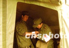 一位女衛(wèi)生軍官三日在新疆地震災(zāi)區(qū)為受傷的戀人包扎傷口。這對(duì)軍中戀人,相隔數(shù)百公里,平日難以相會(huì)。作者:宋吉河