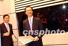 香港財(cái)政司司長梁錦松與財(cái)經(jīng)事務(wù)及庫務(wù)局局長馬時(shí)亨等官員,3月5日在政府總部舉行記者會(huì),就剛發(fā)表的2003至2004年度財(cái)政預(yù)算案,回答記者問題。洪少葵 攝