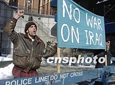 當(dāng)?shù)貢r(shí)間三月七日上午,安理會(huì)關(guān)于伊拉克問(wèn)題部長(zhǎng)級(jí)公開(kāi)會(huì)議在紐約聯(lián)合國(guó)總部舉行。圖為反戰(zhàn)人士在聯(lián)合國(guó)總部門(mén)前高呼反對(duì)對(duì)伊動(dòng)武的口號(hào)。作者:陳建