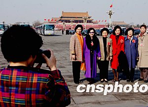 三月八日國(guó)際婦女節(jié)之日在北京出席全國(guó)政協(xié)十屆一次會(huì)議的政協(xié)女委員們,相互在北京天安門(mén)廣場(chǎng)合影。作者:賈國(guó)榮