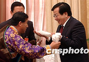 全場(chǎng)穿得最“靚”的青海省海南藏族自治州州長(zhǎng)公保尚,說(shuō)著說(shuō)著便拿出“哈達(dá)”獻(xiàn)給曾慶紅,表達(dá)對(duì)黨中央的謝意。曾慶紅笑著站起來(lái),連迎兩步,雙手接過(guò),連聲說(shuō)“謝謝!”
