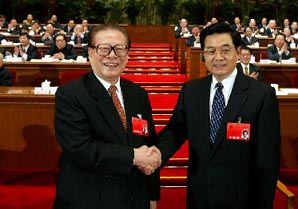 ——中共中央總書記胡錦濤當(dāng)選新一屆國家主席。選舉結(jié)果一經(jīng)宣布,全場響起長時(shí)間的熱烈掌聲。胡錦濤在掌聲中起身向會(huì)場代表三鞠躬,并與前任國家主席江澤民親切握手。