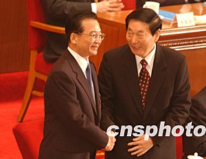 中新社北京三月十六日電本社記者張朔在人民大會(huì)堂現(xiàn)場(chǎng)報(bào)道:根據(jù)國(guó)家主席的提名,今天在這里舉行的十屆全國(guó)人大一次會(huì)議第六次會(huì)議決定,中共中央政治局常委溫家寶為中國(guó)新一屆國(guó)務(wù)院總理。