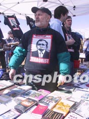 來自紐約“革命書店”的成員十五日在華盛頓紀(jì)念碑下向集會(huì)反戰(zhàn)的示威者兜售英文版的“毛主席語錄”小冊(cè)子。作者:中新社