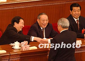 剛剛卸任總理的朱镕基,三月十八日在十屆人大一次會(huì)議閉幕式上,向當(dāng)選副委員長(zhǎng)的盛華仁握手祝賀。作者:賈國榮