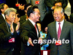 吳邦國委員長十八日下午在北京人民大會(huì)堂會(huì)見出席十屆人大一次會(huì)議的港澳代表。圖為吳邦國與香港代表曾憲梓握手。作者:毛建軍