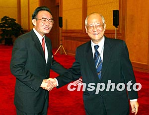 吳邦國委員長十八日下午在北京人民大會(huì)堂會(huì)見出席十屆人大一次會(huì)議的港澳代表。圖為吳邦國與香港代表吳康民握手。作者:毛建軍