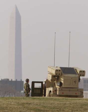 中新網(wǎng)3月19日電 由于美伊戰(zhàn)爭一觸即發(fā),美國政府對(duì)其本土也加強(qiáng)了防御,以對(duì)付可能發(fā)生的恐怖襲擊。圖為當(dāng)?shù)貢r(shí)間3月18日,美軍在華盛頓的一個(gè)山坡上部署“復(fù)仇者”地對(duì)空導(dǎo)彈,遠(yuǎn)處的華盛頓紀(jì)念碑依稀可見。(固山)