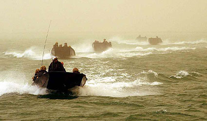 英國(guó)海軍陸戰(zhàn)隊(duì)突擊兵和美國(guó)海軍陸戰(zhàn)隊(duì)員們想重演二戰(zhàn)時(shí)西西里島登陸戰(zhàn)的場(chǎng)面,可伊拉克軍隊(duì)卻不配合:當(dāng)?shù)貢r(shí)間20日晚,科威特北部的美英重炮部隊(duì)、阿拉伯灣北部水域的海軍艦炮、巡航導(dǎo)彈和美國(guó)航母起飛的艦載機(jī)同時(shí)對(duì)伊拉克第二大城市巴士拉的戰(zhàn)略門戶――法奧半島進(jìn)行了煞有介事的狂轟濫炸。
