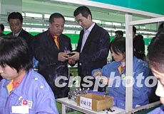 泰國(guó)華人青年商會(huì)潮汕地區(qū)經(jīng)濟(jì)文化訪問(wèn)團(tuán)三月二十八日在廣東汕頭參觀奧迪玩具實(shí)業(yè)有限公司。該公司總經(jīng)理蔡?hào)|青(后左三)向訪問(wèn)團(tuán)團(tuán)長(zhǎng)李桂雄(后左二)介紹情況。作者:王惠存