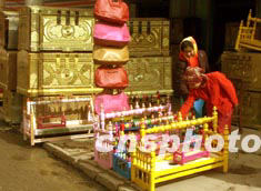 新疆喀什市街頭一對維吾爾族母女日前在家具攤點選擇兒童床。春季的喀什街頭各式民族特色鮮明的家具在街頭熱賣。作者:宋吉河