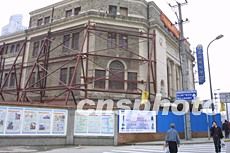 歷史悠久的上海音樂(lè)廳本月即將整體平移,平移距離約六十六點(diǎn)四米,并整體抬升三點(diǎn)三八米。圖為三日正在施工中的上海音樂(lè)廳。作者:湯彥俊