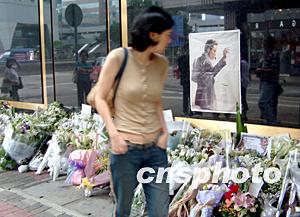 在香港中環(huán)文華酒店外圍,仍有不少獻(xiàn)花致哀的張國(guó)榮歌迷送上鮮花。作者:鄧慶樂(lè)