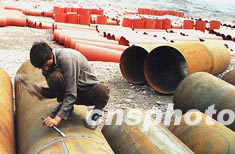 三峽重慶市庫(kù)區(qū)正抓緊時(shí)間對(duì)城市污水環(huán)境實(shí)施治理工程,全市將建19座污水處理廠,日處理污水51萬(wàn)噸,主要分布在江津、涪陵、長(zhǎng)壽、豐都、萬(wàn)州、云陽(yáng)、奉節(jié)等移民遷建城市。圖為奉節(jié)縣正在加工鑄造污水管道。作者:周會(huì)