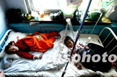 “三一九”豆奶事件后二十天,五歲的史雨平(右)與六歲的王秀文仍在海城市中心醫(yī)院打點(diǎn)滴。當(dāng)?shù)卣Q,自3月19日當(dāng)?shù)?所小學(xué)學(xué)生飲用豆奶以來,先后已有2500多名學(xué)生出現(xiàn)了腹痛、頭暈、惡心等不良反應(yīng)。作者:鄭萍萍
