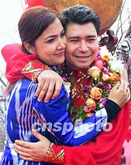 “二OO三阿迪力極限之旅”四月十六日在北京幕田峪長城舉行啟程儀式!案呖胀踝印卑⒌狭⑦M(jìn)行極限表演。圖為阿迪力在臨行前與妻子相擁。作者:盛佳鵬