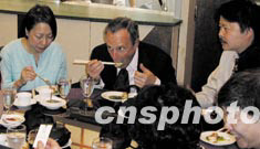 喜愛中餐的紐約市長布隆博格(左二)十六日中午在紐約華埠中餐館“糖潮食坊”宴請華裔人士,以行動回?fù)羧A埠有非典型肺炎的謠言。作者:僑報