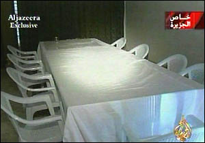 其中一個房間是一個裝飾有伊拉克鷹的簡陋的錄像室。他可能在這里錄下了他的“不投降”的電視講話。后面的背景窗簾正好和發(fā)表講話那天的背景一致。在一臨時會議室里有塑料椅子和鋪著床單的桌子,在另一房間里則還有放著皺巴巴的毯子的一些床鋪。(春風(fēng))
