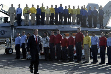 美東部時(shí)間5月1日,美國(guó)總統(tǒng)布什在從海灣返航的“林肯”號(hào)航母上發(fā)表講話,稱伊拉克戰(zhàn)爭(zhēng)的“主要戰(zhàn)斗行動(dòng)”已經(jīng)結(jié)束,聯(lián)軍在戰(zhàn)斗中取得了勝利。