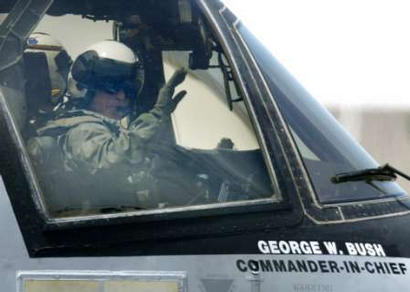 但布什特意穿著橄欖綠色的飛行服、足蹬作戰(zhàn)靴、戴著飛行頭盔,坐在副駕駛的位置上,光臨“林肯號(hào)”。動(dòng)身前,為防萬(wàn)一,他在白宮的游泳池里接受了水下救護(hù)訓(xùn)練;上飛機(jī)前,也聽(tīng)了彈射跳傘的操作講解。