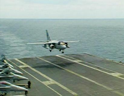 查資料才發(fā)現(xiàn),做好防護(hù)準(zhǔn)備是有道理的:布什坐的S-3B“海盜式”噴氣式偵察機(jī),采用“攔截式”方法在航空母艦上降落。也就是說(shuō),飛機(jī)以二、三百公里的時(shí)速著陸時(shí),要靠飛機(jī)的制動(dòng)勾抓住攔截索,產(chǎn)生阻力,在一百多米內(nèi)的航母甲板跑道上完全停住。四月一日,對(duì)伊戰(zhàn)爭(zhēng)期間,有過(guò)一架同類型的S-3B飛機(jī),降落時(shí)沒(méi)停住,從“星座號(hào)”航空母艦上滑到了海里。