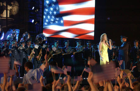 美國空軍預(yù)備軍官樂隊(duì)在哥倫比亞公司在2日錄制的特別節(jié)目“搖滾美國——向美軍致敬”中,登上杜魯門號航空母艦與獲葛萊美獎(jiǎng)的女歌手席琳狄翁一起表演“天佑美國”。(路透)