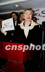 紐約州聯(lián)邦參議員希拉里.·克林頓五日到訪紐約華埠,手舉“支持亞洲餐館”的標(biāo)語,支持華埠商家。中新社記者:趙海燕