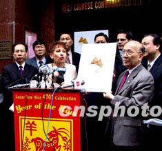 美國會(huì)議員維拉貴茲五日站在勿街中華公所門前舉起當(dāng)日出版的《每日新聞》報(bào)上登出的一條宣傳華埠沒有“非典”的公益廣告說,華埠是安全的,人們可以放心地到華埠來。(右一為中華公所主席伍廷典)中新社記者:趙海燕