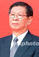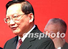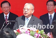 國務(wù)委員唐家璇,五月八日在深圳皇崗口岸舉行的中央政府支援香港抗炎醫(yī)用物品交接儀式上發(fā)表講話。中新社記者 錢興強 攝