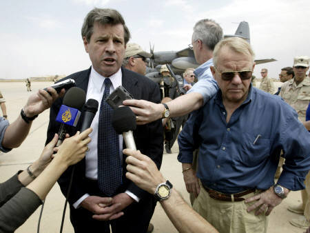 新任美國駐伊拉克行政長官布雷默(左)12日飛抵伊拉克巴格達(dá)機(jī)場,正式到職就任。布雷默將接替前美國將軍加納,負(fù)責(zé)監(jiān)督伊重建工作與政治重組。圖為布雷默當(dāng)天在巴格達(dá)機(jī)場接受媒體訪問。