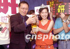 歌星關(guān)心妍5月14日在香港尖東Neway卡拉OK舉行的新歌祝捷會(huì)上,與唱片公司高層齊開香檳,慶祝其新歌《優(yōu)先訂座》在香港三大中文電臺(tái)于上周的播放率均名列三甲。中新社傳真 鄧慶樂 攝