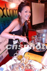 為一家纖體產(chǎn)品出任代言人的藝人利嘉兒,5月15日示范烹調(diào)高卡路里美食,笑談天堂式減肥方法。中新社傳真 洪少葵 攝