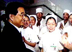 上午10時,胡錦濤總書記來到四川省人民醫(yī)院看望醫(yī)務(wù)人員和病員,并在這里親自主持了醫(yī)務(wù)界及有關(guān)方面代表參加的防治非典座談會。