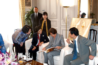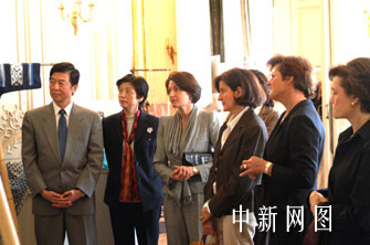 拉法蘭總理夫人一進(jìn)大門,就對(duì)迎候的中國駐法大使吳建民和夫人施燕華公參說:“訪問中國是我的一個(gè)愿望。由于中國目前發(fā)生的特殊情況,我沒能于上月隨同丈夫一起訪華,感到非常遺憾。今天我把原本要一同訪華的所有夫人們帶到這里,參觀巴黎的中國---新近成立的巴黎中國文化中心,也是了卻一個(gè)心愿!