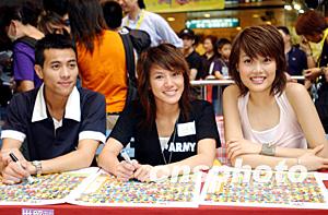 名歌星容祖兒、梁漢文及何韻詩18日在世貿中心為購買門票支持善舉的歌迷簽名。