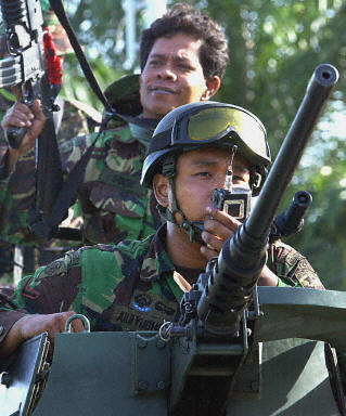 印度尼西亞政府18日宣布將對(duì)亞齊叛軍實(shí)行軍事打擊,并在該國(guó)亞齊省實(shí)施戒嚴(yán)。圖為印尼政府軍在亞齊省內(nèi)加強(qiáng)安全警戒。