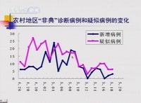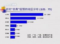 從全國農(nóng)村非典疫情地區(qū)分布來看,75個(gè)縣中22個(gè)在山西省,山西占了75個(gè)縣的29%,17個(gè)在河北,占23%,11個(gè)縣在內(nèi)蒙古,占15%。也就是說,農(nóng)村非典疫情地區(qū)主要集中在華北地區(qū),尤其是山西、河北和內(nèi)蒙古的農(nóng)村地區(qū)。