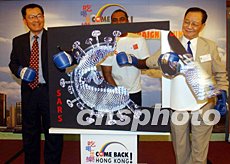 香港推出“吃喝玩樂(lè)Come Back Hong Kong”運(yùn)動(dòng)!俺院韧鏄(lè)Come Back Hong Kong”運(yùn)動(dòng)五月十九日在香港展開,其旨在鼓勵(lì)香港市民拋開對(duì)非典型肺炎疫情的憂慮,重新投入積極的生活。圖為香港總商會(huì)總裁翁以登(左)、香港餐飲聯(lián)業(yè)協(xié)會(huì)會(huì)長(zhǎng)伍德良(右)等擊打“SARS病毒”從而為該活動(dòng)揭幕。中新社記者:潘索菲