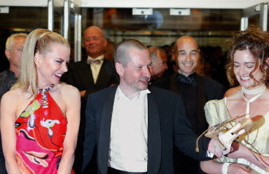 19日,丹麥導演馮特里爾的影片《道格鎮(zhèn)》(Dogville)在戛納電影宮的盧米埃爾大廳放映。影片劇組在首場記者觀摩后舉行了新聞發(fā)布會,導演馮特里爾(中)、女主角妮可-基德曼(左)等出席了記者會。