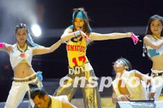 歌星陳慧琳5月24日出席香港大球場茁壯行動(dòng)“1:99音樂會(huì)”慈善演唱,與舞蹈員載歌載舞。中新社傳真 鄧慶樂 攝