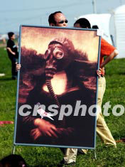一名北京藝術(shù)家捧出戴防毒面具的《蒙娜麗莎》油像新作,參加京郊五月下旬抗擊“非典”為主題的“藍天不設(shè)防”藝術(shù)行動。中新社記者:鄒憲