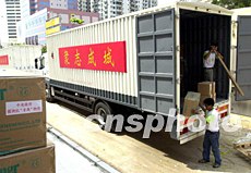 中央政府支援澳門抗擊非典型肺炎的醫(yī)用物品,二十七日運抵設(shè)在澳門旅游中心的“抗非典應(yīng)變小組總指揮部”。中新社記者:李剛